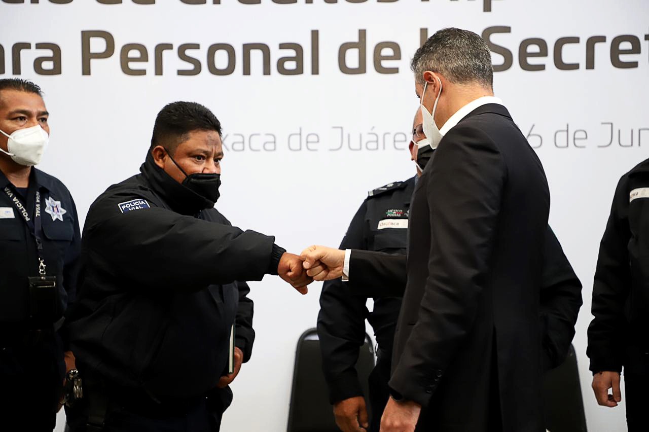 En Palacio de Gobierno y ante elementos de la Secretaría de Seguridad del Estado y de la Fiscalía General del Estado de Oaxaca, el Gobernador apuntó que este anuncio es reflejo del reconocimiento al valor y prioridad que tiene la tarea y compromiso de este cuerpo de seguridad para la sociedad oaxaqueña.