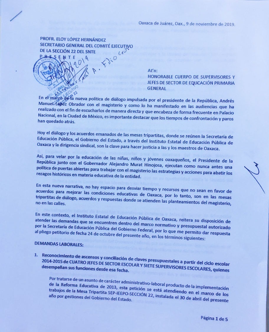 El Instituto Estatal de Educación Pública de Oaxaca (IEEPO) reitera su disposición de atender las demandas que se encuentren dentro del marco normativo y presupuestal autorizado por la Secretaría de Educación Pública (SEP) del Gobierno Federal, por lo que dio respuesta al pliego petitorio de fecha 24 de octubre del presente año entregado por los supervisores y jefes de sector de Educación Primaria General.