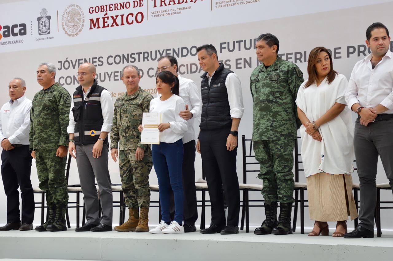 En este acto, el Jefe del Poder Ejecutivo Estatal y el funcionario federal entregaron diplomas a 10 jóvenes que destacaron por su buen desempeño en esta capacitación, en la cual recibieron conocimientos en protección civil, primeros auxilios, prevención y combate de incendios, evacuación de inmuebles y gestión integral del riesgo.