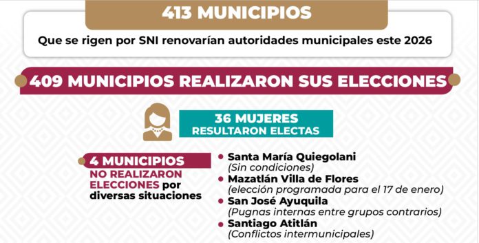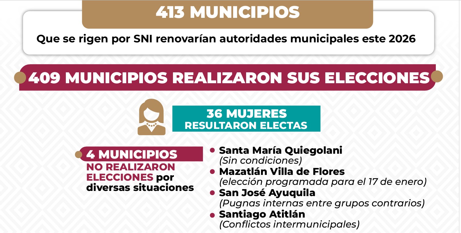 De acuerdo con el informe, 413 municipios renovarían autoridades municipales durante 2026. De ese total, 409 municipios lograron realizar sus elecciones, mientras que cuatro no pudieron llevar a cabo el proceso. Santa María Quiegolani, Mazatlán Villa de Flores, San José Ayuquila y Santiago Atitlán, donde se reportaron condiciones adversas como falta de acuerdos comunitarios, pugnas internas o conflictos intermunicipales.