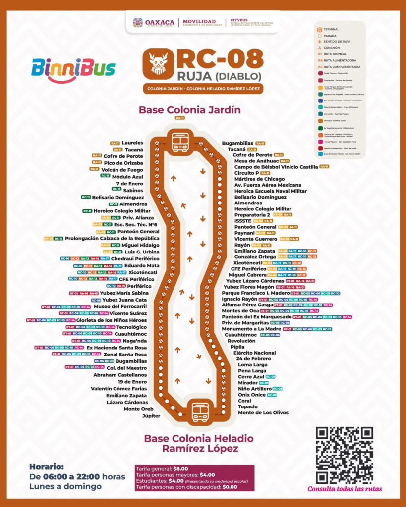 El Sistema de Transporte Colectivo Metropolitano BinniBus Oaxaca puso en marcha la nueva ruta RC08 “Ruja”, que significa Diablo en lengua afro de la variante de La Llanada; con la cual suman 19 en operación, las cuales transforman la conectividad y movilidad en la capital del estado.