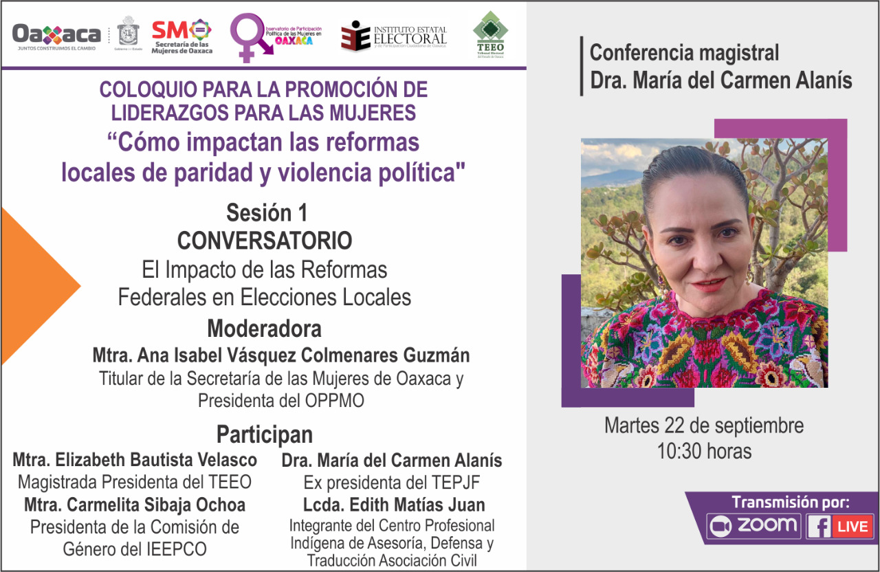 El martes 21, a las 10:30 horas, María del Carmen Alanís Figueroa, ex magistrada del Tribunal Electoral del Poder Judicial de la Federación (TEPJF), dictará la conferencia magistral “El impacto de las Reformas Federales en elecciones locales”, después se llevará a cabo un conversatorio con expertas en el tema.
