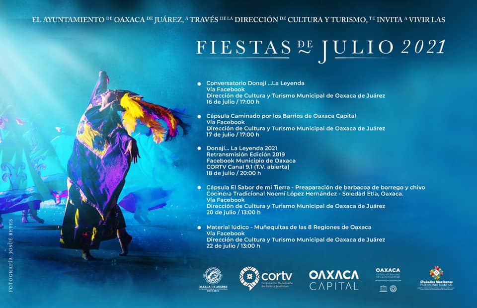 Además, para enmarcar estas importantes presentaciones dancísticas, la Dirección de Cultura y Turismo preparó el programa virtual “Fiestas de julio 2021”, dentro del cual se encuentra el conversatorio “Donají… La Leyenda”, que podrá seguirse el 16 de julio a las 17:00 horas, a través de la página de Facebook de la Dirección de Cultura y Turismo: www.facebook.com/CulturayTurismoOaxaca.
