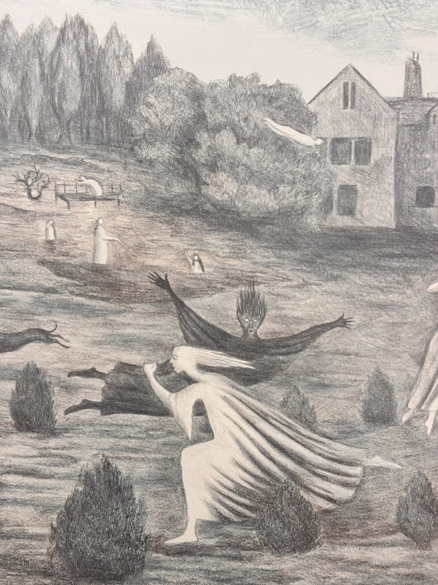 La muestra reúne la pieza Crookhey Hall, proveniente de una colección privada, así como litografías de la serie El Dibbuk, realizadas en el Taller de Gráfica Mexicana y pertenecientes a la Colección Pago en Especie de la SHCP.