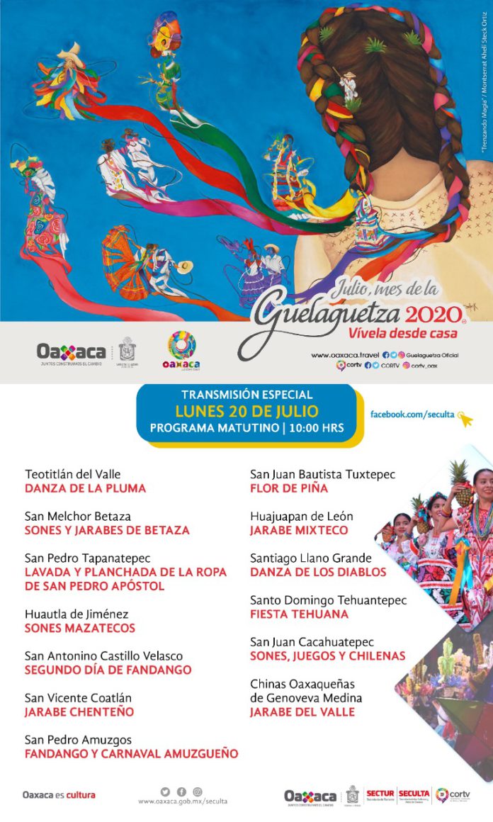 Derivado de la pandemia por COVID-19, este año la máxima fiesta folclórica será realizada de manera digital y podrá ser compartida a nivel mundial a través de la señal de la Corporación Oaxaqueña de Radio y Televisión (Cortv), así como de las redes sociales de las Secretarías de Economía (SE), Turismo (Sectur) y de las Culturas y Artes de Oaxaca (Seculta).
