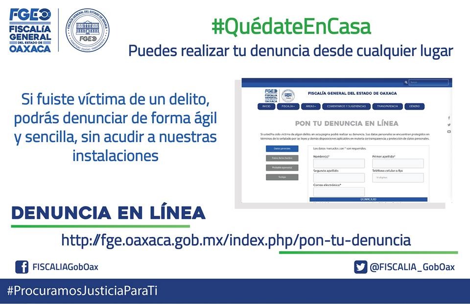 Con el objetivo de hacer más eficiente el sistema de procuración de justicia en favor de la sociedad, el Fiscal General del Estado de Oaxaca, Rubén Vasconcelos Méndez, anunció este jueves el lanzamiento de la plataforma digital: Denuncia en Línea, la cual está disponible en la página oficial de la Fiscalía General del Estado de Oaxaca: http://fge.oaxaca.gob.mx/index.php/pon-tu-denuncia.