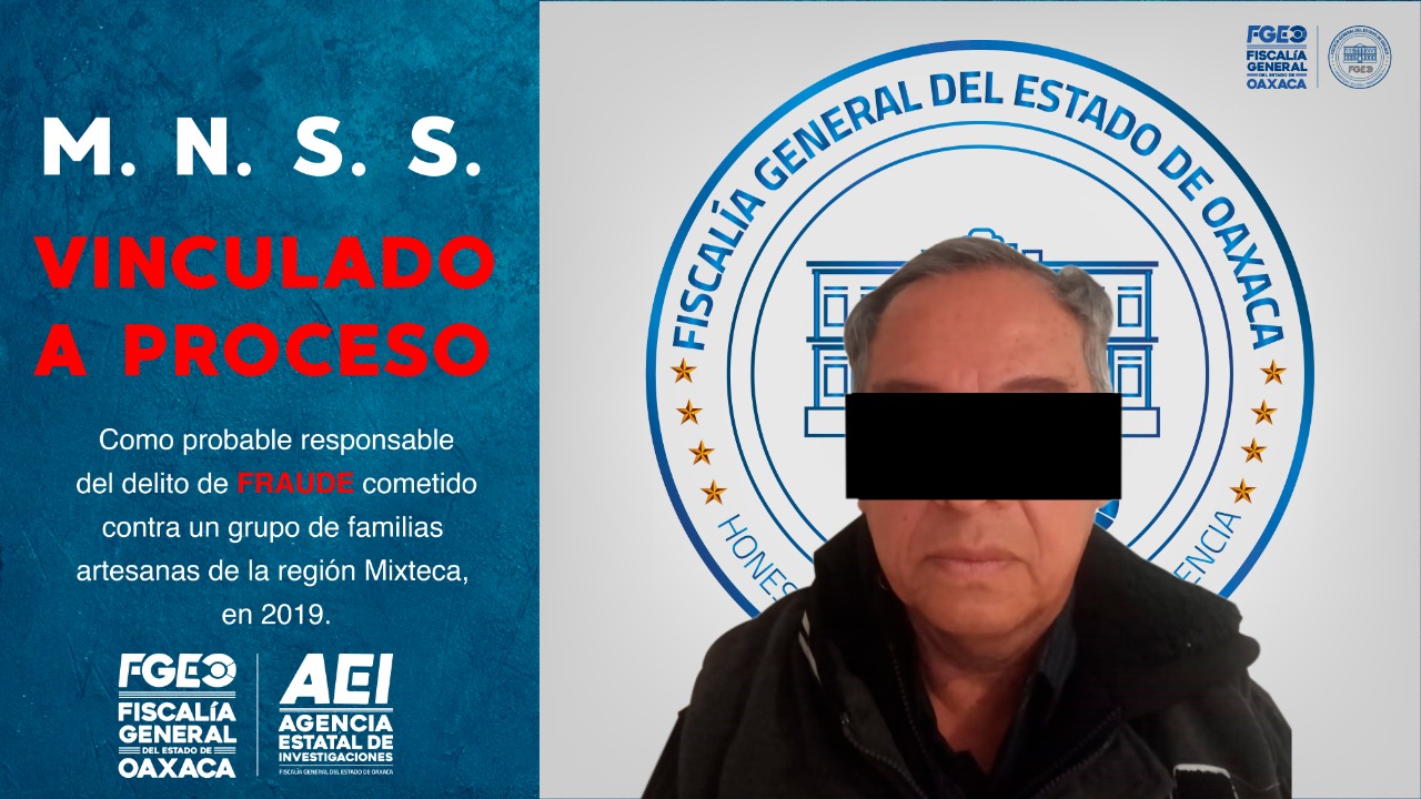 Comprometida con garantizar la justicia en favor de las familias oaxaqueñas, la Fiscalía General del Estado de Oaxaca (FGEO), aprehendió y logró vincular a proceso al masculino M. N. S. S., quien es señalado como probable responsable del delito de fraude en perjuicio patrimonial de 22 familias artesanas originarias de diversas comunidades del Distrito de Nochixtlán, región Mixteca.