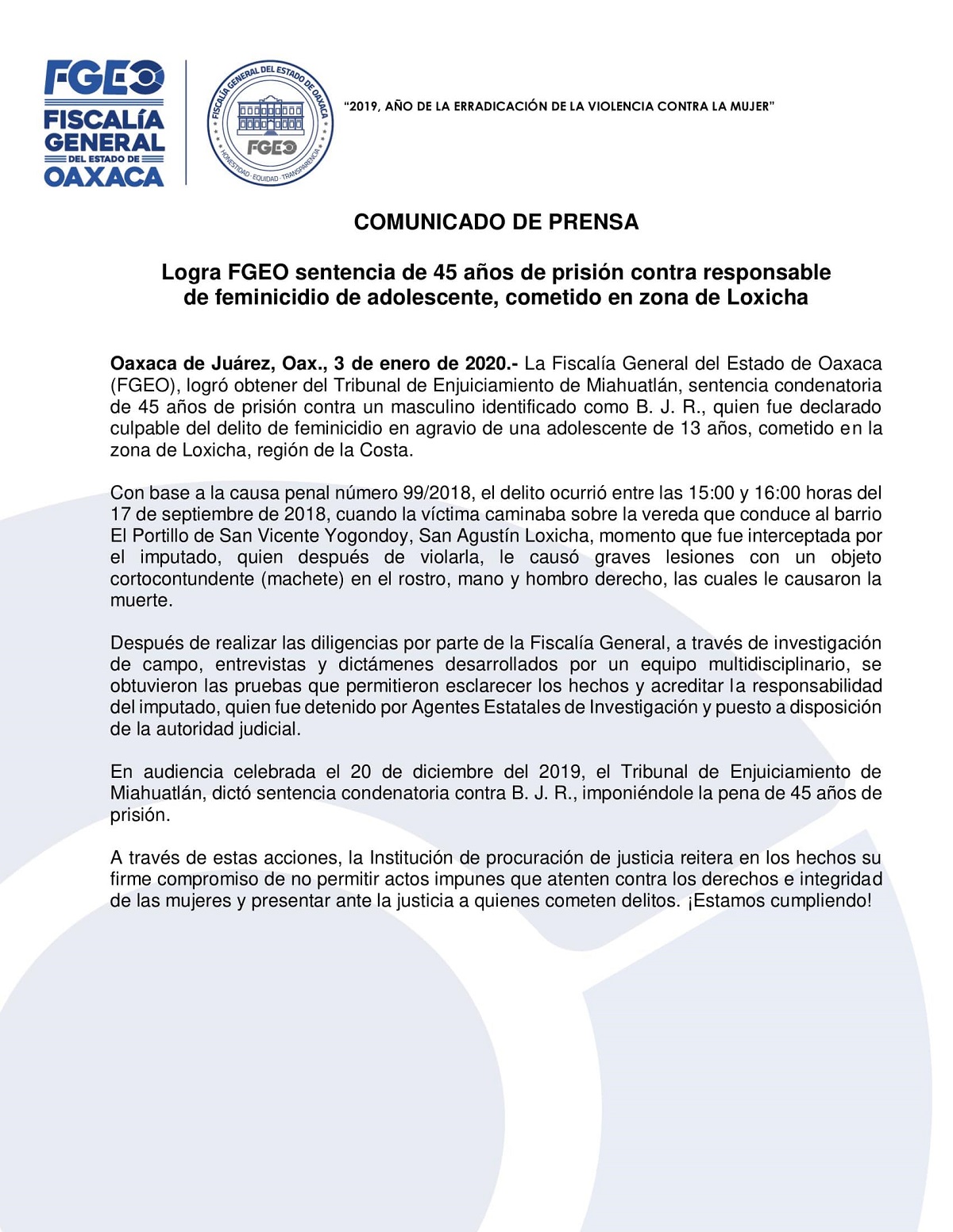 La Fiscalía General del Estado de Oaxaca (FGEO), logró obtener del Tribunal de Enjuiciamiento de Miahuatlán, sentencia condenatoria de 45 años de prisión contra un masculino identificado como B. J. R., quien fue declarado culpable del delito de feminicidio en agravio de una adolescente de 13 años, cometido en la zona de Loxicha, región de la Costa.