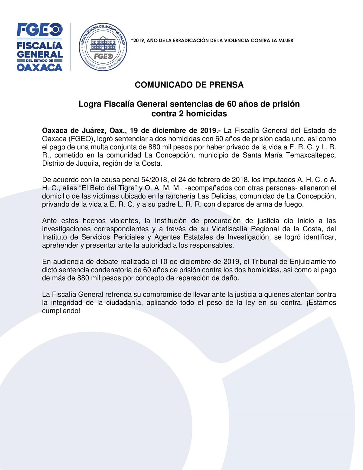 La Fiscalía General del Estado de Oaxaca (FGEO), logró sentenciar a dos homicidas con 60 años de prisión cada uno, así como el pago de una multa conjunta de 880 mil pesos por haber privado de la vida a E. R. C. y L. R. R., cometido en la comunidad La Concepción, municipio de Santa María Temaxcaltepec, Distrito de Juquila, región de la Costa.