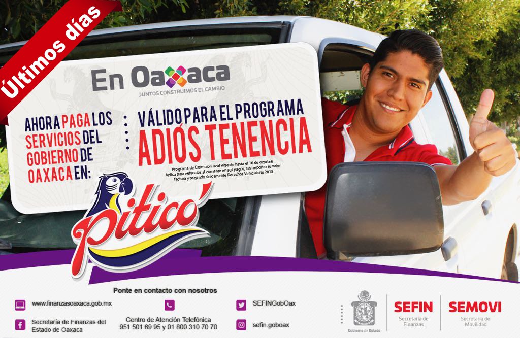 El pago de adeudos de años anteriores puede efectuarse en línea desde el portal de la Secretaría de Finanzas www.finanzasoaxaca.gob.mx, las personas también pueden imprimir su formato y acudir a cualquiera de los 450 Centros de Cobro Autorizados que comprenden instituciones bancarias y Tiendas Piticó participantes.