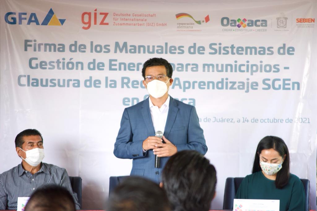 Cabe destacar -precisó- que a través de la firma de los seis Manuales en Sistemas de Gestión de la Energía se ratifica el compromiso del Gobierno del Estado y la autoridad municipal para la transición energética en Oaxaca, atendiendo el ODS 7 Energía Asequible y no contaminante de la Agenda 2030.