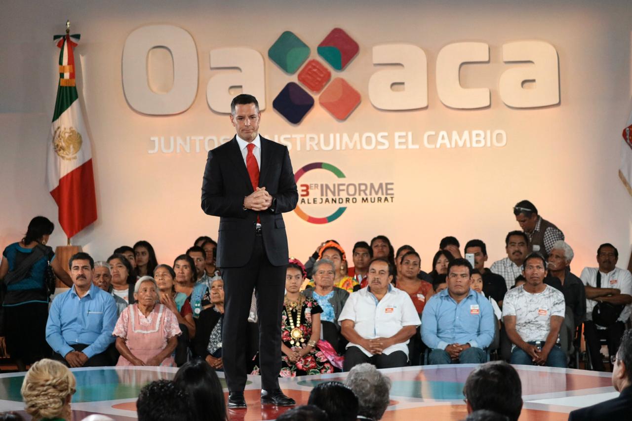 Las acciones para combatir la pobreza han dado resultados, señaló el Gobernador Constitucional del Estado de Oaxaca, Alejandro Murat Hinojosa durante el mensaje que dio en el marco de la entrega de su Tercer Informe de Gobierno. Asimismo, dio a conocer que más de 132 mil oaxaqueñas y oaxaqueños que antes del inicio de su gobierno carecían de servicios básicos, vivienda digna y acceso a una alimentación variada, saludable y suficiente ya no sufren de estas carencias.