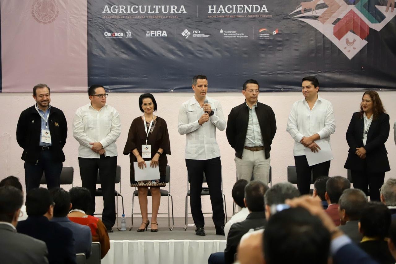 Murat Hinojosa celebró la realización de este encuentro que permitirá durante dos días -17 y 18 de octubre- escuchar las voces de las y los productores oaxaqueños, empresarios y organizaciones afines, para alcanzar y proponer acuerdos que permitan esquemas de financiamiento rural, enfocados a quienes exportan sus mercancías, pero también a quienes las distribuyen en el entorno local y, principalmente, a pequeños y pequeñas productoras.