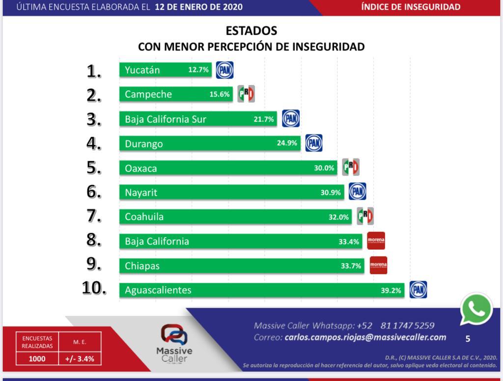De acuerdo a la encuesta realizada durante el presente mes de enero, por la empresa Massive Caller, el estado de Oaxaca se posiciona en el quinto lugar con menor percepción de inseguridad a nivel nacional.