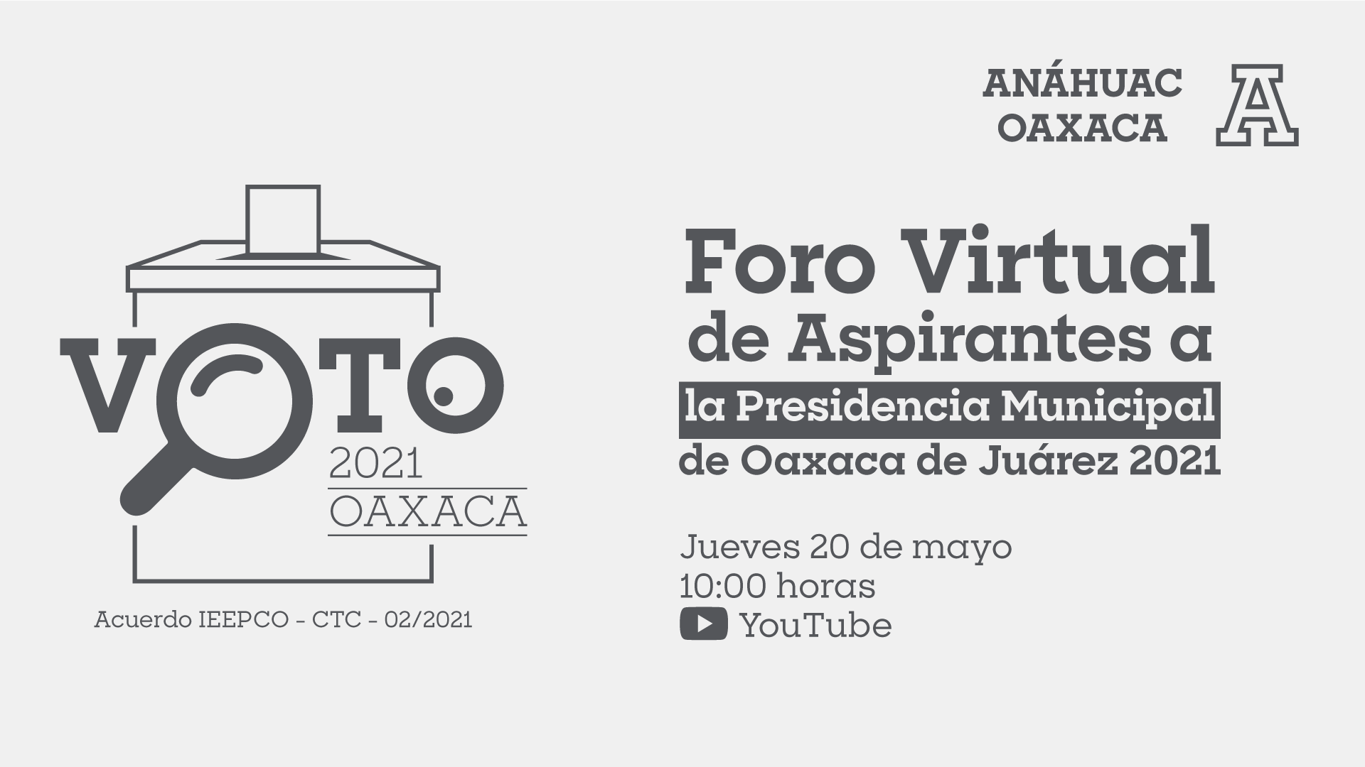 Para incentivar el voto informado de la ciudadanía, la Escuela de Ciencias Jurídicas y Sociales (ECJS) de la Universidad Anáhuac de Oaxaca (UAO), en colaboración con el Instituto Estatal Electoral y de Participación Ciudadana de Oaxaca (IEEPCO), organizan el Foro Virtual de Aspirantes a la Presidencia Municipal de Oaxaca de Juárez 2021, como ejercicio democrático de participación ciudadana.