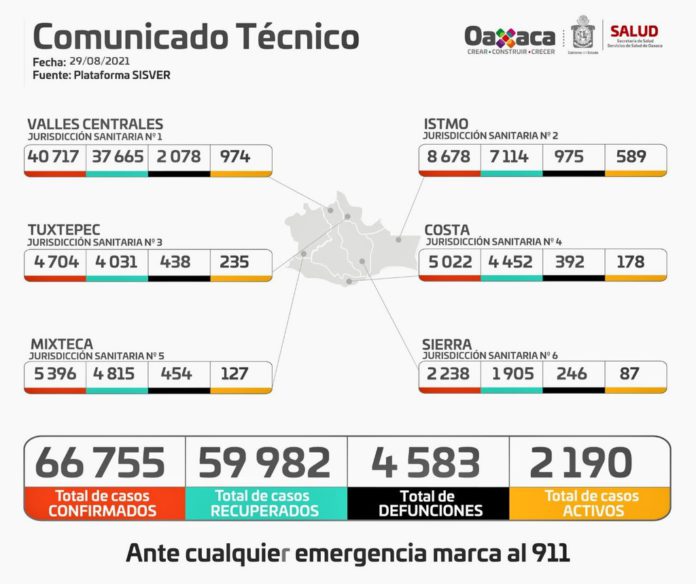 Los contagios por COVID-19 continúan en aumento en la entidad. Durante la semana del 22 al 28 de agosto, se registraron tres mil 291 casos, lo que elevó a 66 mil 564 la cifra global de personas con diagnóstico confirmatorio de esta enfermedad respiratoria, informó la jefa del Departamento de Normatividad en Equipo Médico de la Dirección de Atención Médica de los Servicios de Salud de Oaxaca (SSO), Nahiely Tapia Peláez.