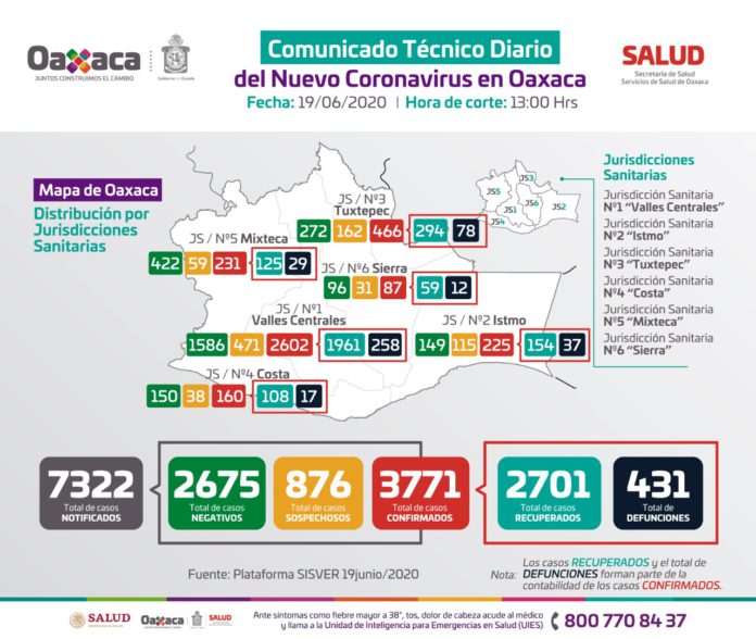 Al corte del panorama epidemiológico de este viernes 19 de junio, los Servicios de Salud de Oaxaca (SSO) tienen contabilizados 639 casos activos de COVID-19, distribuidos en 116 municipios; siendo con el mayor número de registros la Jurisdicción Sanitaria número uno Valles Centrales con 383, seguida de Tuxtepec con 94, Mixteca 77, Costa 35, Istmo 34 y la Sierra (Norte) 16.