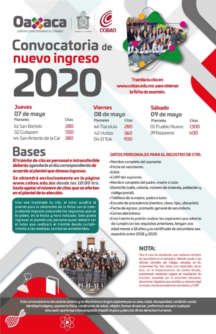 Derivado de la contingencia sanitaria por el COVID-19, el Colegio de Bachilleres del Estado de Oaxaca (Cobao) modifica las fechas en su convocatoria de nuevo ingreso 2020, a fin de privilegiar la salud de las y los jóvenes que desean ingresar en alguno de los 68 planteles.