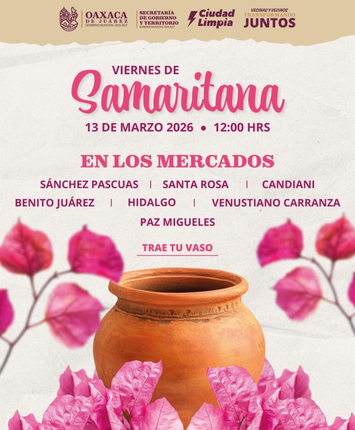 Con el propósito de preservar y promover una de las tradiciones más representativas de la capital oaxaqueña, gobierno municipal de Oaxaca de Juárez invita a la ciudadanía a participar en la celebración del Viernes de Samaritana, que se realizará este 13 de marzo a partir de las 12:00 horas en diversos mercados de la ciudad.