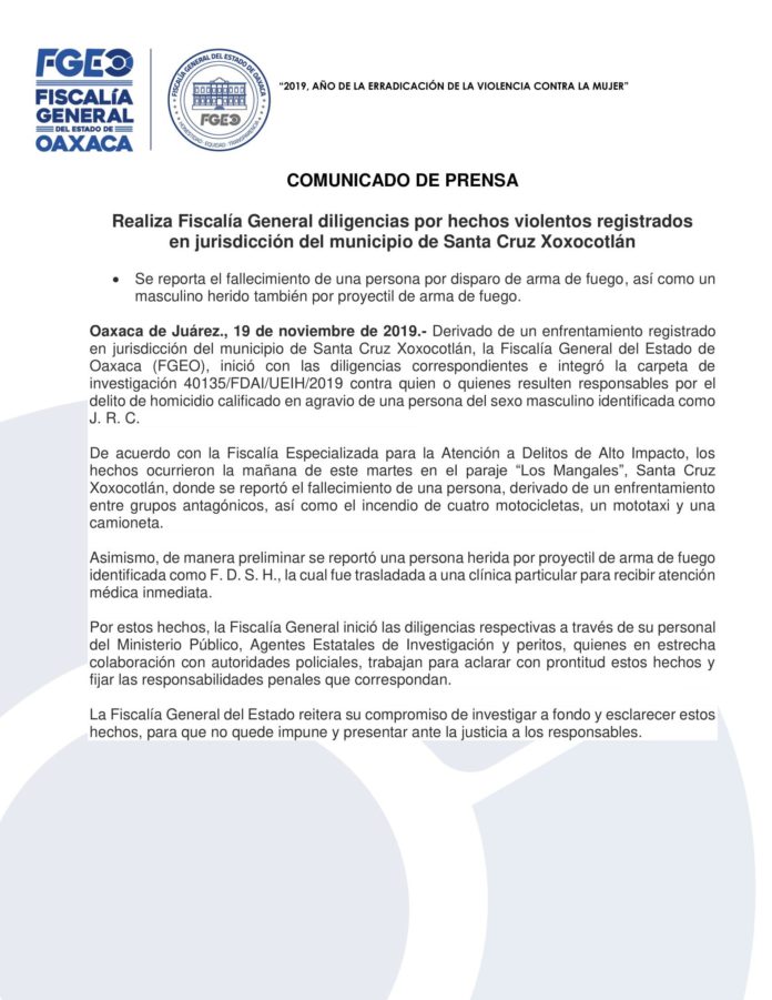 Derivado de un enfrentamiento registrado en jurisdicción del municipio de Santa Cruz Xoxocotlán, la Fiscalía General del Estado de Oaxaca (FGEO), inició con las diligencias correspondientes e integró la carpeta de investigación 40135/FDAI/UEIH/2019 contra quien o quienes resulten responsables por el delito de homicidio calificado en agravio de una persona del sexo masculino identificada como J. R. C.