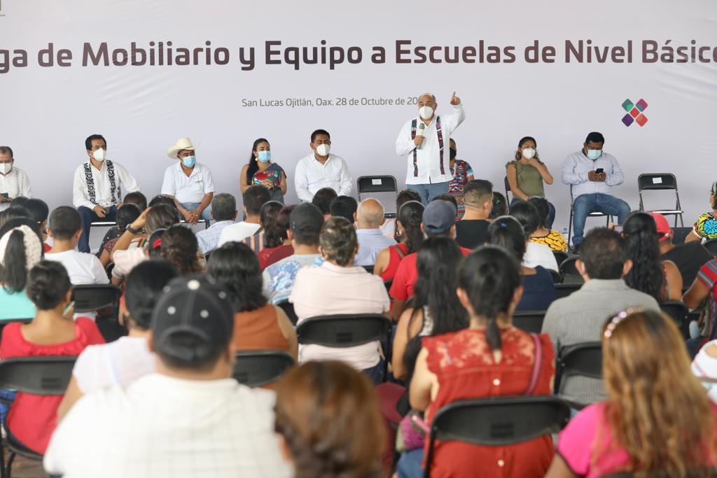 San Lucas Ojitlán.- En cumplimiento a la palabra del gobernador Alejandro Murat Hinojosa de fortalecer la educación de calidad, inclusiva y con equidad, el director general del Instituto Estatal de Educación Pública de Oaxaca (IEEPO), Francisco Ángel Villarreal, realizó la entrega de mobiliario y equipo escolar a 88 escuelas de la región Chinantla en la Cuenca del Papaloapan y una de San Pablo Villa de Mitla, en beneficio de siete mil 505 estudiantes y 447 docentes.