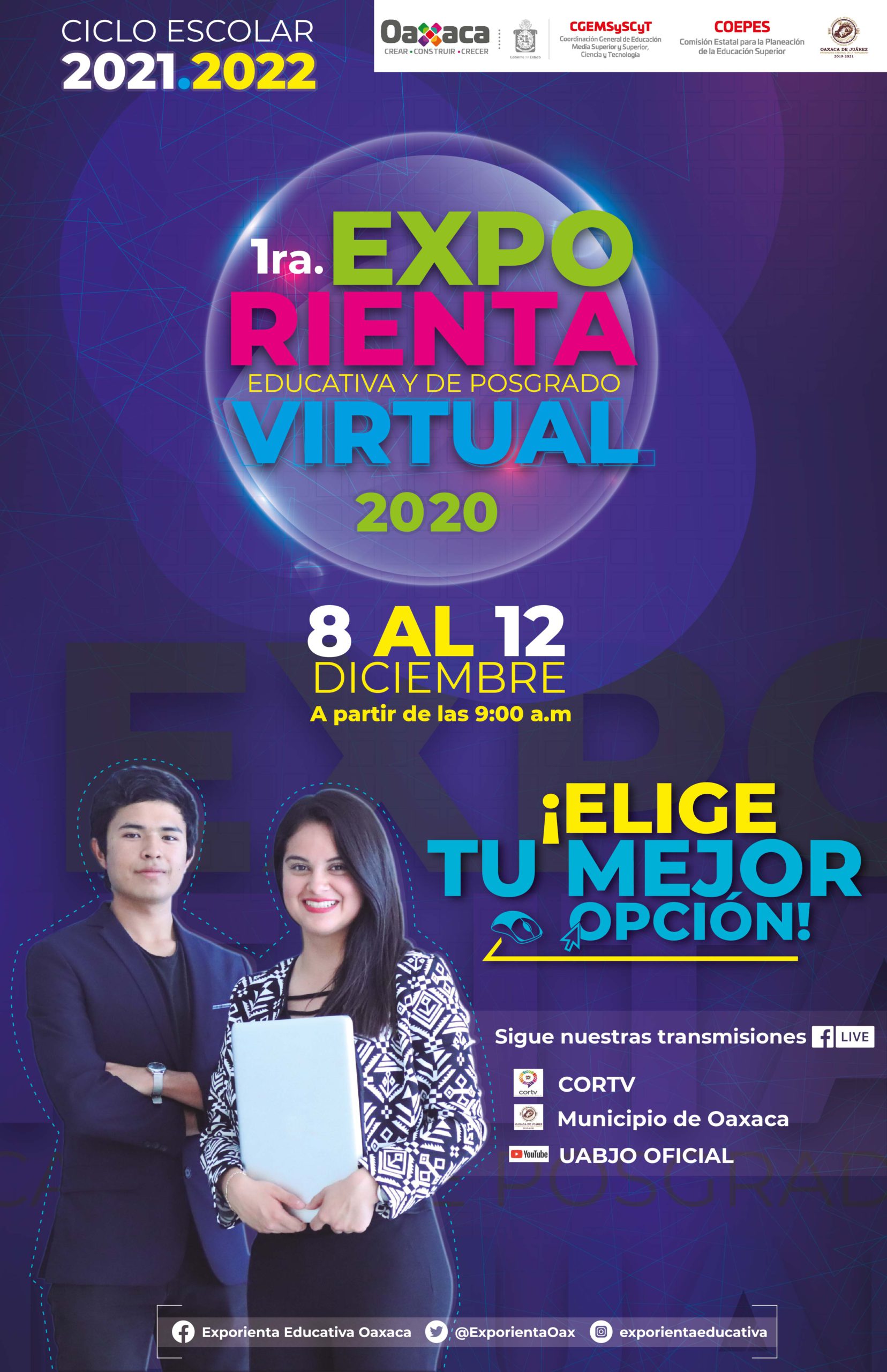 El Gobierno del Estado, a través de la Coordinación General de Educación Media Superior y Superior, Ciencia y Tecnología y la Comisión Estatal para la Planeación de la Educación Superior en el Estado de Oaxaca, conjuntamente con las instituciones de educación superior, media superior y capacitación para el trabajo y la colaboración del municipio de Oaxaca de Juárez, llevarán a cabo la Primera Exporienta Educativa y de Posgrado Virtual 2020 del 8 al 11 de diciembre de 2020.