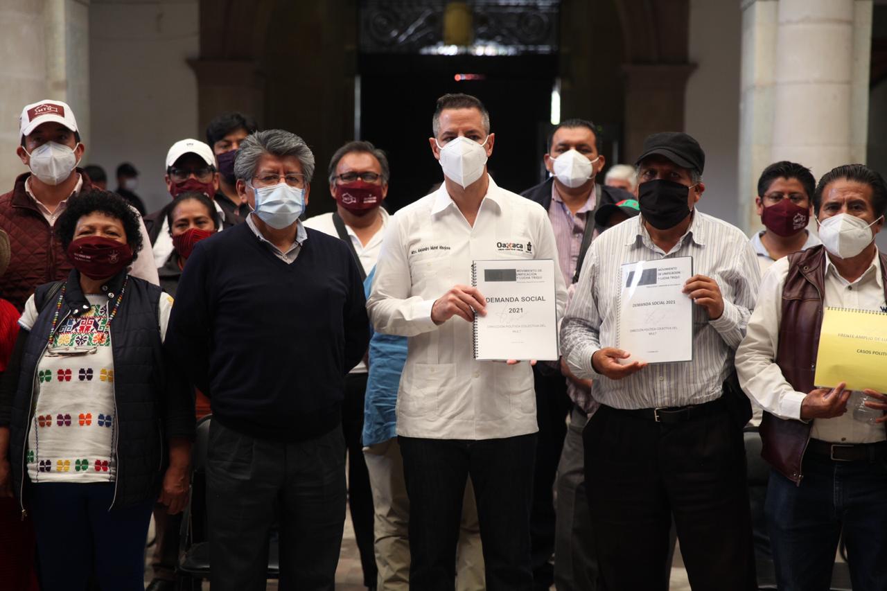 El gobernador Alejandro Murat Hinojosa reconoció la disposición al diálogo de los representantes de las organizaciones del Movimiento de Unificación de Lucha Triqui (MULT), del Frente Amplio de Lucha Popular (FALP), y de la Asamblea de los Pueblos en Defensa del Territorio, la Educación Pública, Gratuita y los Derechos Humanos, quienes hicieron entrega de su respectivos Pliegos Petitorios, enmarcados en el pronunciamiento de paz en Oaxaca.