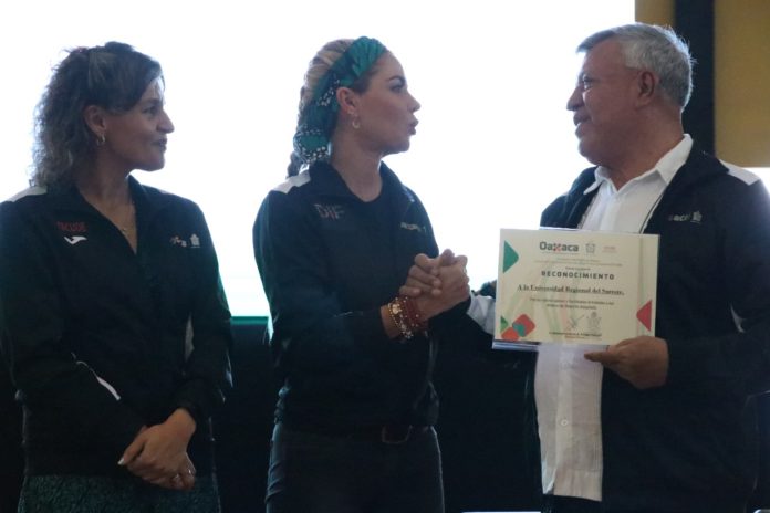 De esta manera, la presidenta honoraria del Sistema DIF Oaxaca, Ivette Morán de Murat, acompañada de la directora de la Cecude, Montserrat de los Ángeles Aragón Heinze, otorgó un reconocimiento al rector de esta institución educativa, Benjamín Smith Arango, por su apoyo invaluable en los dos últimos años.