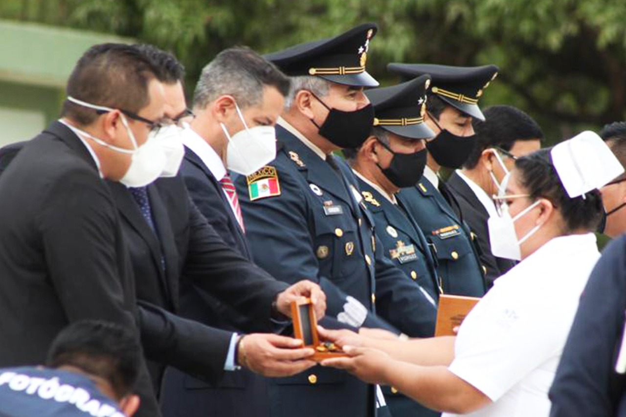 En este acto, la Condecoración “Miguel Hidalgo” fue entregada a la soldado auxiliar asistente de enfermería, Osiris Tomás Ruiz Noriega; a la soldado auxiliar asistente de enfermería Sofía Soledad Alvarado García; a los enfermeros civiles Benigno Ruiz Hernández y Julio César Villalobos; y a las enfermeras civiles, Itandehui Marini Ruiz Hernández y Azalia Villegas López.
