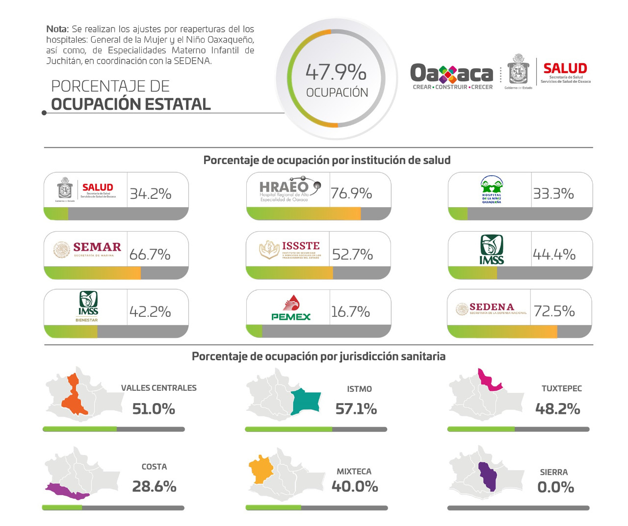Referente al panorama jurisdiccional, Valles Centrales contabiliza 47 mil 064 casos confirmados y dos mil 325 defunciones, Istmo 10 mil 914 casos confirmados y mil 131 fallecimientos, Tuxtepec cinco mil 275 casos confirmados y 506 muertes, Costa cinco mil 633 casos confirmados y 447 pérdidas, Mixteca seis mil 040 casos confirmados y 526 defunciones, Sierra dos mil 706 casos confirmados y 278 fallecimientos.