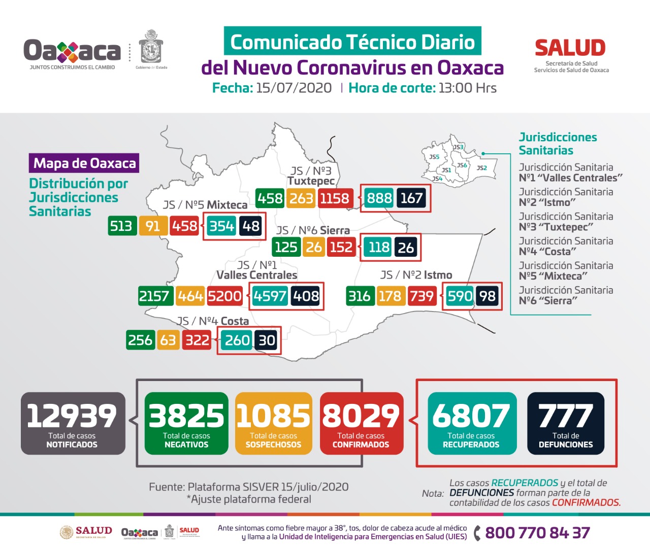 El director de Atención Médica de los Servicios de Salud de Oaxaca (SSO), Erick Azamar Cruz, en representación del titular de la dependencia, Donato Casas Escamilla, dio a conocer el panorama epidemiológico de este miércoles 15 de julio, en la que se registran 8 mil 029 casos confirmados a COVID-19 en todo el estado, registrando este día 65 casos nuevos.