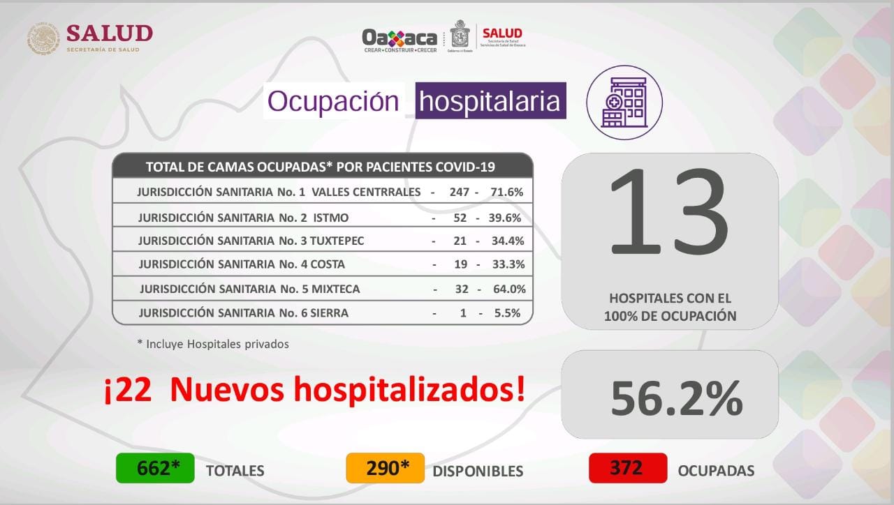 Es decir, a la fecha se tiene un total de 372 pacientes hospitalizados, de los cuales 22 ingresaron en las últimas 24 horas, del global 247corresponden a personas residentes de Valles Centrales, 52 del Istmo, 21 de Tuxtepec, 19 de la Costa, 32 de la Mixteca y uno de la Sierra.