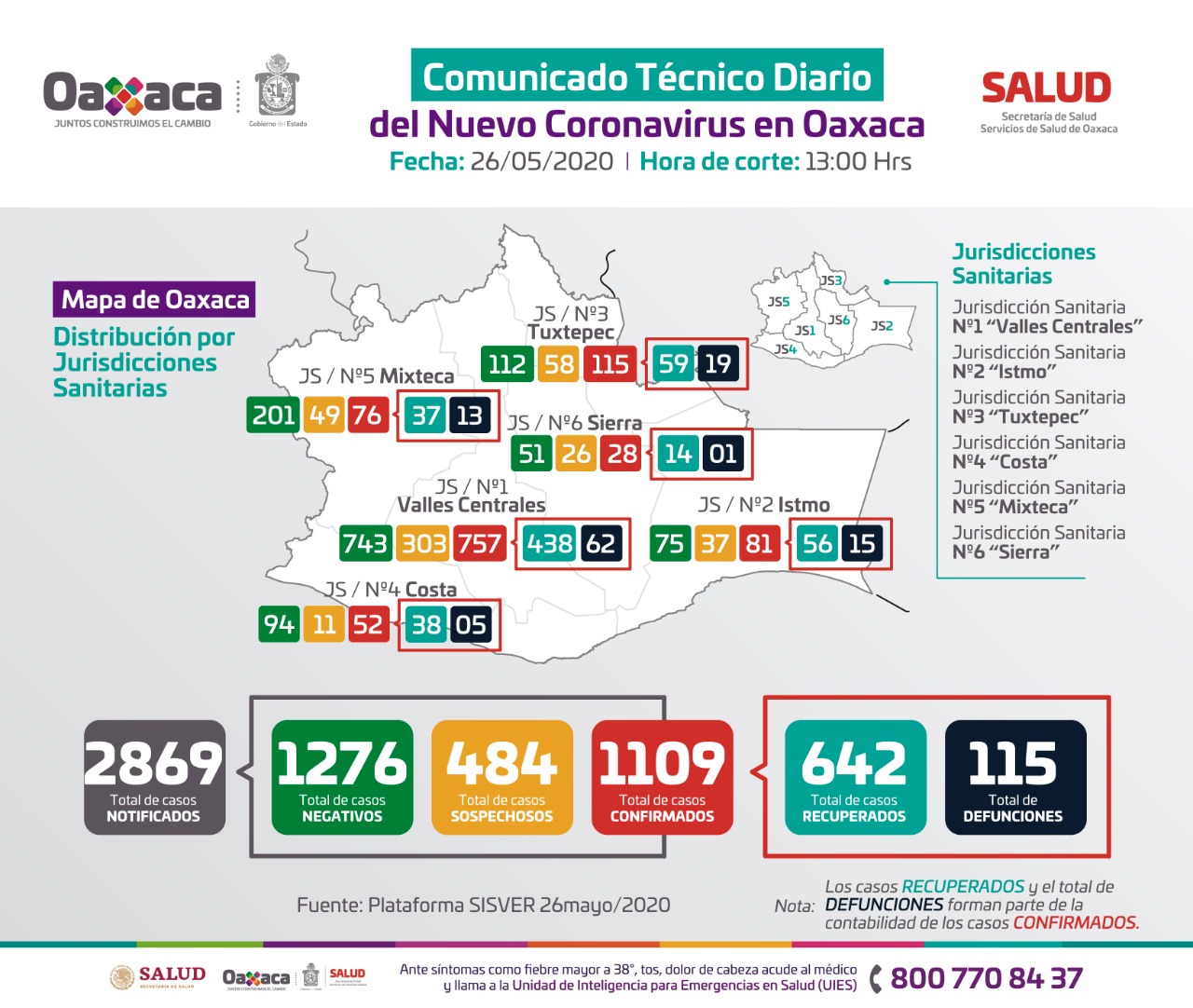Refirió que de los casos positivos, 757 se encuentran en la Jurisdicción Sanitaria de Valles Centrales, 81 en el Istmo, 115 en Tuxtepec, 52 en la Costa, 76 en la Mixteca y 28 en la Sierra Norte.