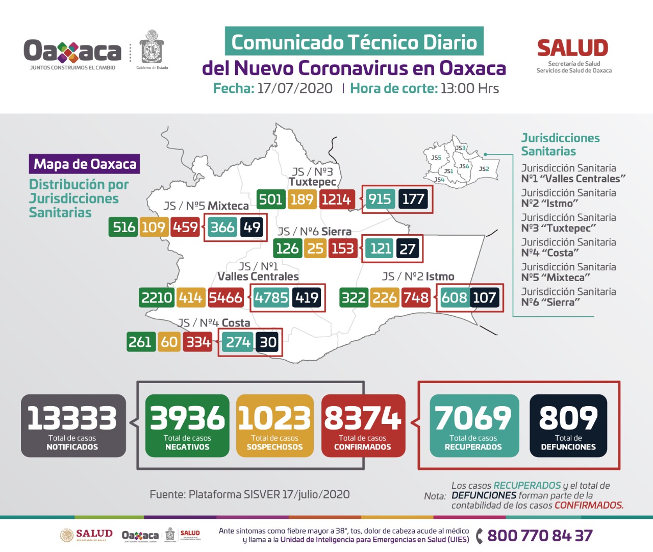 El director de Atención Médica de los Servicios de Salud de Oaxaca (SSO), Erick Azamar Cruz, en representación del titular, Donato Casas Escamilla, informó que este 17 de julio, se han confirmado ocho mil 374 casos confirmados a COVID-19 en la entidad, que suman 223 casos nuevos.