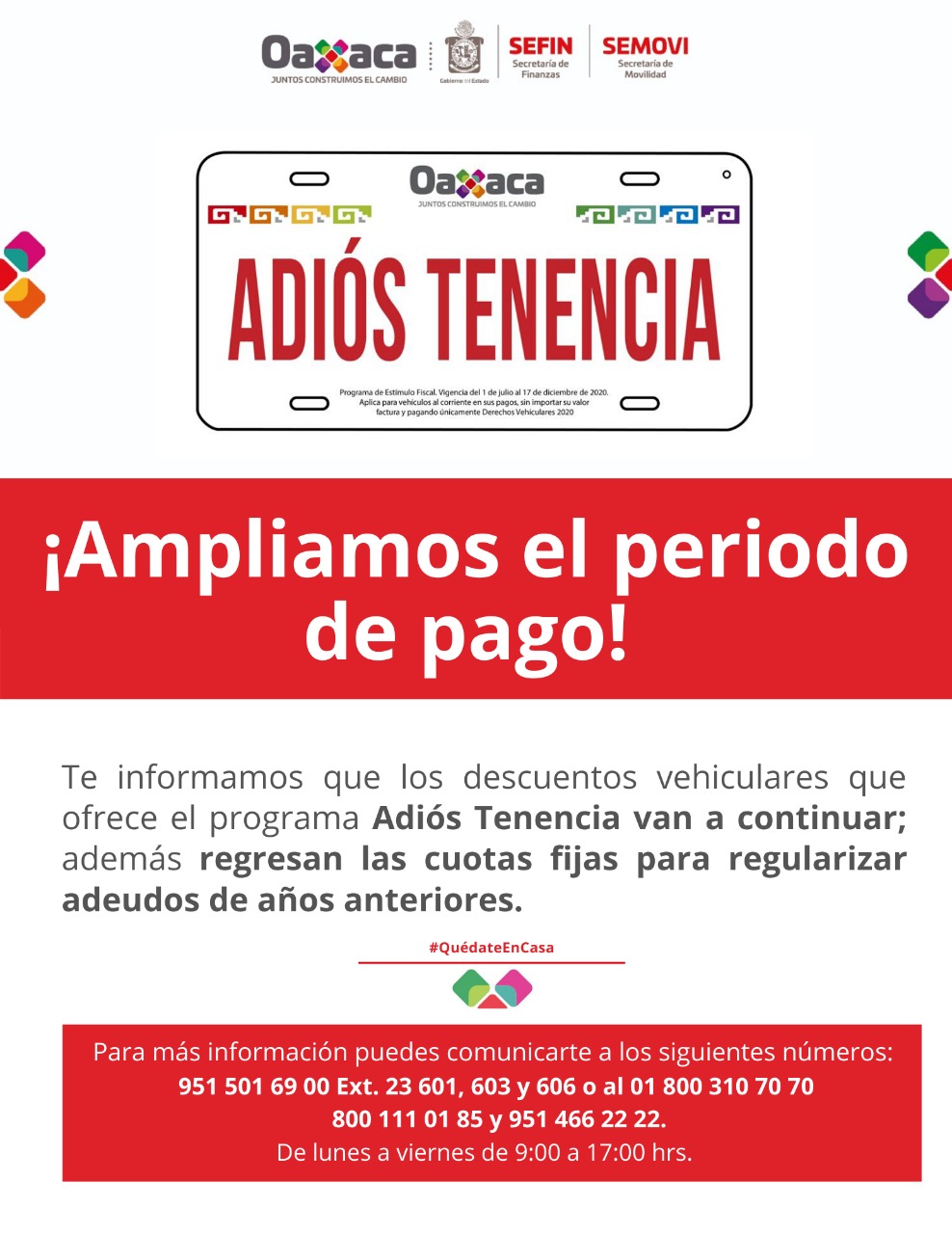 Con el objetivo de impulsar acciones y programas en beneficio de la economía familiar, por instrucción del gobernador Alejandro Murat Hinojosa, la Secretaría de Finanzas (Sefin) y la Secretaría de Movilidad (Semovi), anuncian el regreso del programa de descuentos para regularizar adeudos vehiculares de años anteriores, así como la extensión del programa “Adiós Tenencia”, que se mantendrán vigentes hasta el 17 de diciembre de 2020.
