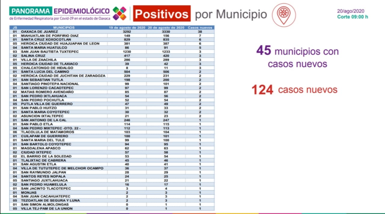 Los 124 casos nuevos se registran en 45 municipios, siendo los de mayor número el de Oaxaca de Juárez con 38, Miahuatlán de Porfirio Díaz siete, Santa Cruz Xoxocotlán y Huajuapan de León seis cada uno, Santa María Huatulco cinco, el resto tres, dos y uno.