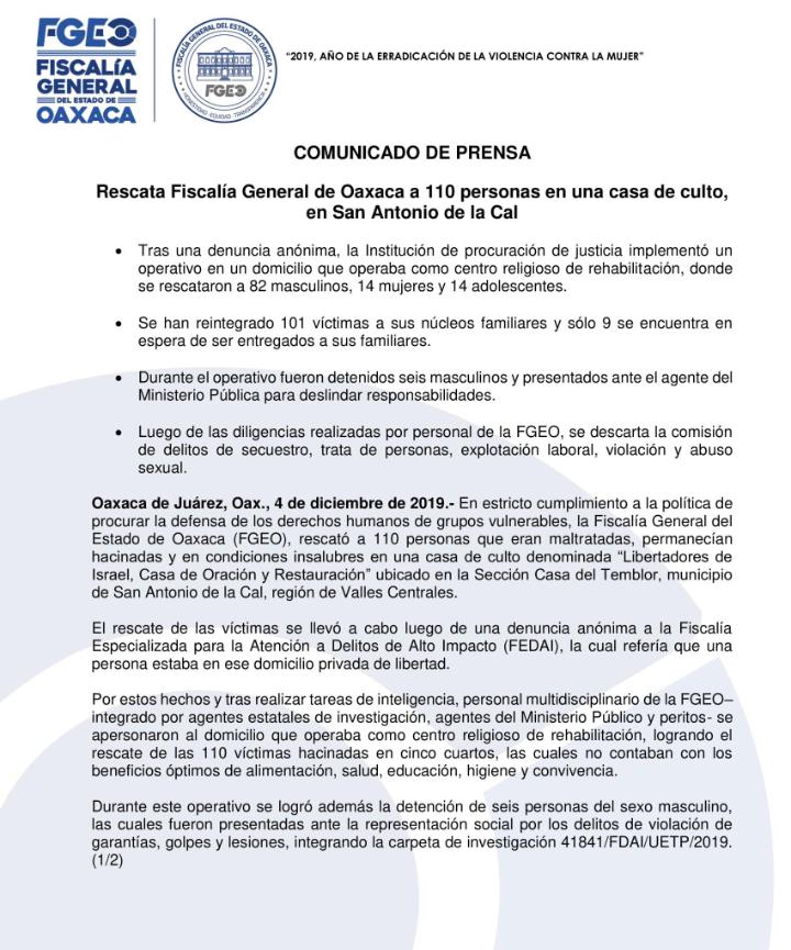 Por estos hechos y tras realizar tareas de inteligencia, personal multidisciplinario de la FGEO–integrado por agentes estatales de investigación, agentes del Ministerio Público y peritos- se apersonaron al domicilio que operaba como centro religioso de rehabilitación, logrando el rescate de las 110 víctimas hacinadas en cinco cuartos, las cuales no contaban con los beneficios óptimos de alimentación, salud, educación, higiene y convivencia.