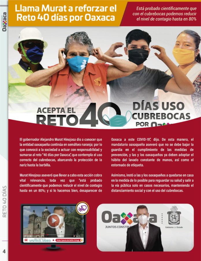 La cobertura informativa de esta semana aborda el llamado del Ejecutivo estatal a reforzar el Reto 40 días por Oaxaca, convocando a la ciudadanía a actuar con responsabilidad y unirse a esta iniciativa, que contempla el uso correcto del cubrebocas, a fin de reducir el número de contagio de coronavirus que permitan a Oaxaca el regreso a la ‘nueva normalidad’.