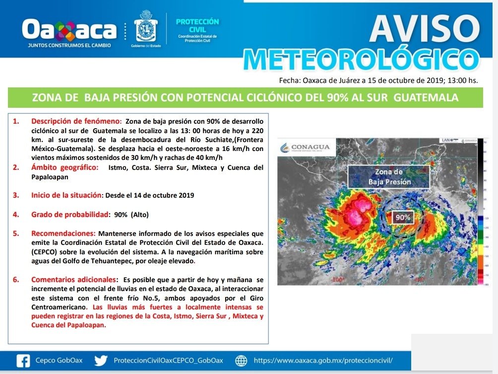 Heliodoro Díaz Escárraga, titular de la CEPCO, indicó que los Consejos Municipales se activarán de manera preventiva derivado del pronóstico, así como del comportamiento del fenómeno hidrometeorológico; toda vez que la zona de baja presión con 80% de desarrollo ciclónico al sur de El Salvador, provocará fuertes lluvias en las regiones de Mixteca, Istmo, Costa y Sierra Sur.