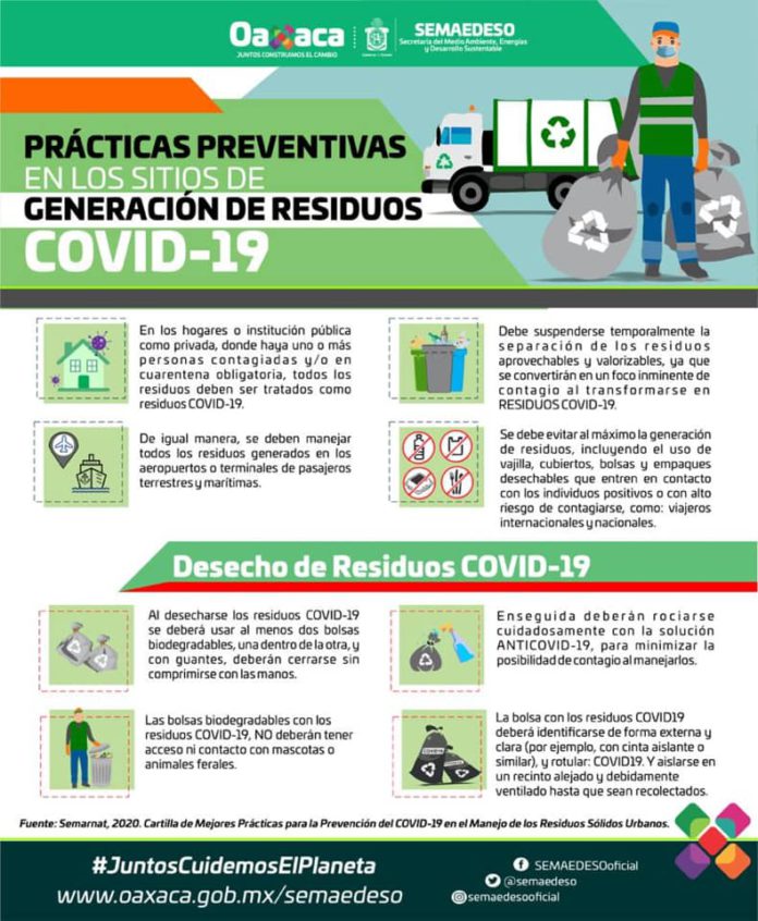 El Gobierno de Oaxaca a través de la Secretaría del Medio Ambiente, Energías y Desarrollo Sustentable (Semaedeso) dio a conocer las medidas responsables y preventivas para el manejo de los residuos COVID-19 en hogares donde se registre un caso positivo y en terminales marítimas como terrestres.