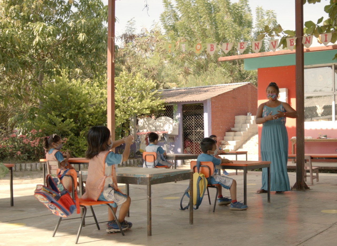 “Es maestra toda aquella que siembra conocimiento y cree en el valor infinito de compartirlo con el mundo. Nunca detenerse y hacer avanzar a los demás, eso es ser maestro de vida. Los oaxaqueños llevamos la enseñanza por dentro”, se lee mientras una maestra con cubrebocas realiza su importante labor ante niños que, igual con cubrebocas y guardando la sana distancia, reciben el conocimiento con alegría.
