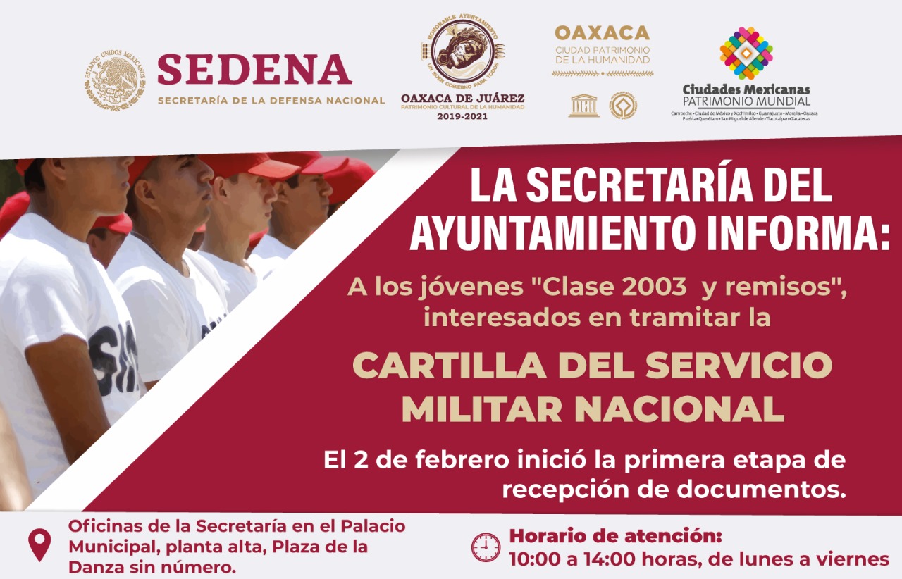 El Ayuntamiento de Oaxaca de Juárez, a través de la Secretaría del Ayuntamiento, informa a los interesados en realizar el trámite de la Cartilla del Servicio Militar Nacional que, actualmente, se está recibiendo la documentación de la “Clase 2003 y remisos”.