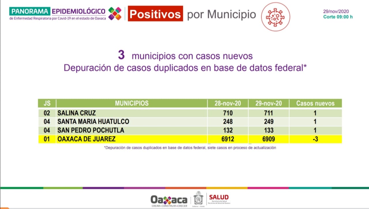 Según los datos oficiales, puntualizó que los pacientes nuevos reportados en las últimas 24 horas se ubican en Salina Cruz, Santa María Huatulco y San Pedro Pochutla.