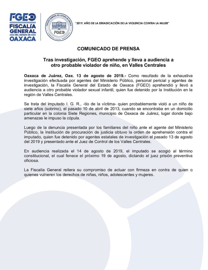 Luego de la denuncia presentada por los familiares del niño ante el agente del Ministerio Público, la Institución de procuración de justicia obtuvo la orden de aprehensión contra el imputado, quien fue detenido por agentes estatales de investigación el pasado 13 de agosto del 2019 y presentado ante el Juez de Control de los Valles Centrales.