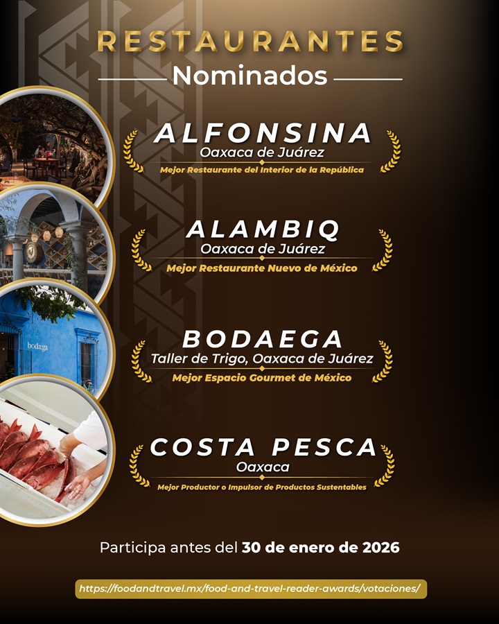 Este respaldo puede hacerse extensivo a negocios oaxaqueños nominados, entre ellos: Alfonsina, como Mejor Restaurante del Interior de la República; Alambiq, como Mejor Restaurante Nuevo de México; Bodaega, como Mejor Espacio Gourmet de México; y Costa Pesca, en la categoría Mejor Productor o Impulsor de Productos Sustentables.