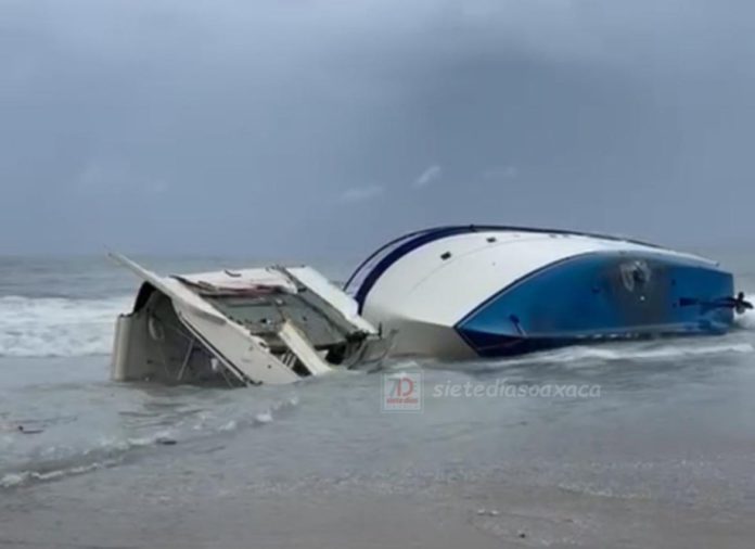 De acuerdo con autoridades municipales, el incidente ocurrió alrededor de las 11:00 horas en playa Delfines, entre las agencias de Puerto Escondido y Bajos de Chila, cuando la embarcación “Vagary”, de 52 pies de eslora y 54 toneladas de peso, perdió potencia en uno de sus motores. Las olas impactaron con fuerza contra el casco, provocando que el yate se volcara y quedara varado sobre la arena.